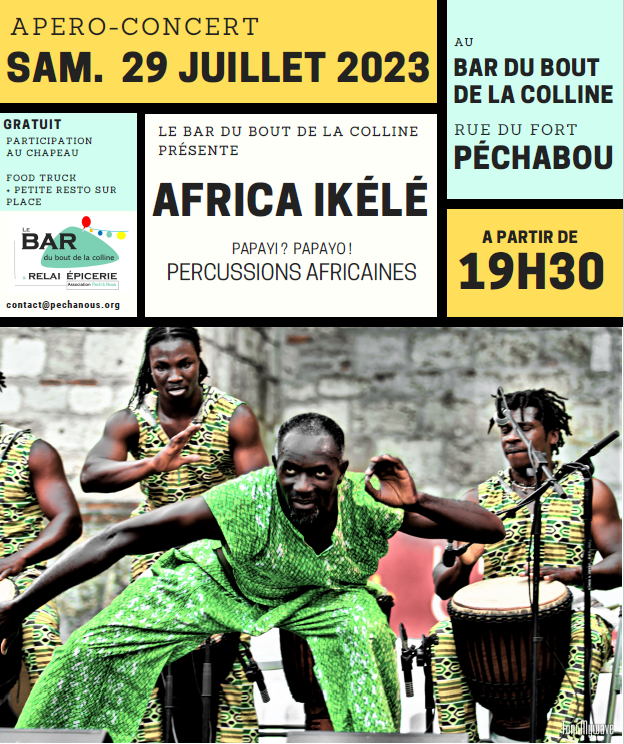 Samedi 29 juillet, à partir de 19 h 30, apéro-concert pour danser : avec Africa Ikélé : percussions africaines.