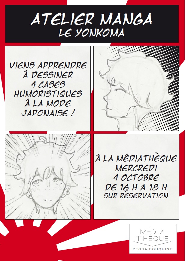Mercredi 4 octobre de 16 h à 18 h, la médiathèque propose un atelier dessin manga pour les plus de 10 ans animé par un professeur de Toulouse Manga, école passionnée et passionnante dont la devise est « Authenticité, professionnalisme et esprit de famille ». À Toulouse Manga, tous les professeurs de manga ont été formés par des mangaka japonais. Leur volonté, c’est de mêler étroitement les cultures japonaise et française et de développer des liens et des échanges avec le Japon. Cela permet d’offrir à leurs élèves l’ensemble des savoirs techniques et des richesses culturelles nécessaires au développement de leurs élans créatifs.
