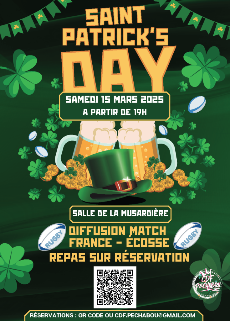 Le samedi 15 mars 2025, à partir de 19 h, rejoignez-nous à la salle de la Musardière pour une soirée spéciale Saint-Patrick !