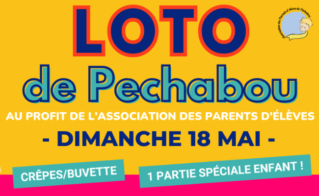 Le dimanche 18 mai, à 14 h, l’association des parents d’élèves (APE) de Pechabou organise un loto à la salle Musardière ; il y aura beaucoup de lots à gagner ! |