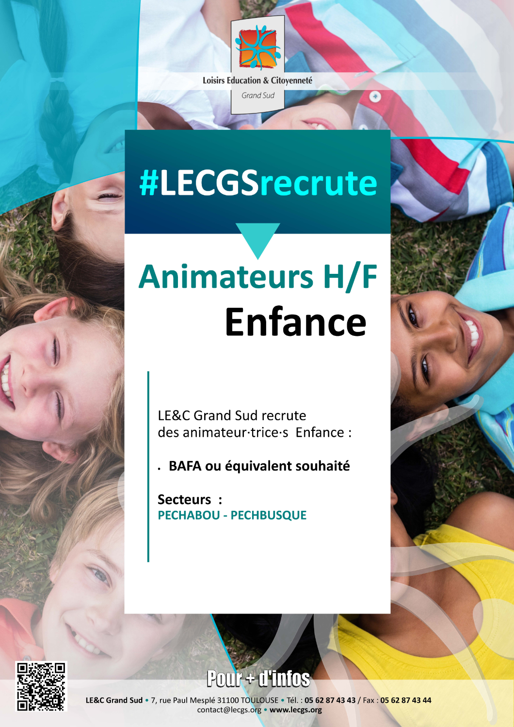 Vous avez le BAFA ou équivalent, le LEC Grand Sud recrute des animateurs enfance pour Pechabou et Pechbusque.
