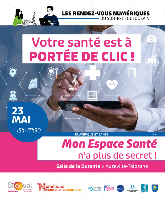 Le Sicoval, dans le cadre de ces rendez-vous numériques organise une session pour apprendre à se servir du carnet de santé numérique personnel et sécurisé proposé par l’assurance maladie, le 23 mai de 15 h à 17 h 30, salle de la Durante à Auzeville-Tolosane. Pour plus d’information : 06 07 17 50 85 ou le site du Sicoval.