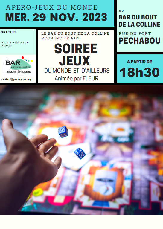 Mercredi 29 novembre, à partir de 18 h 30, le Bar du Bout de la Colline vous propose une soirée jeux du monde et d’ailleurs, vaste programme. La séance sera animée par Fleur, ludo-animatrice à l’école de Pechabou.
